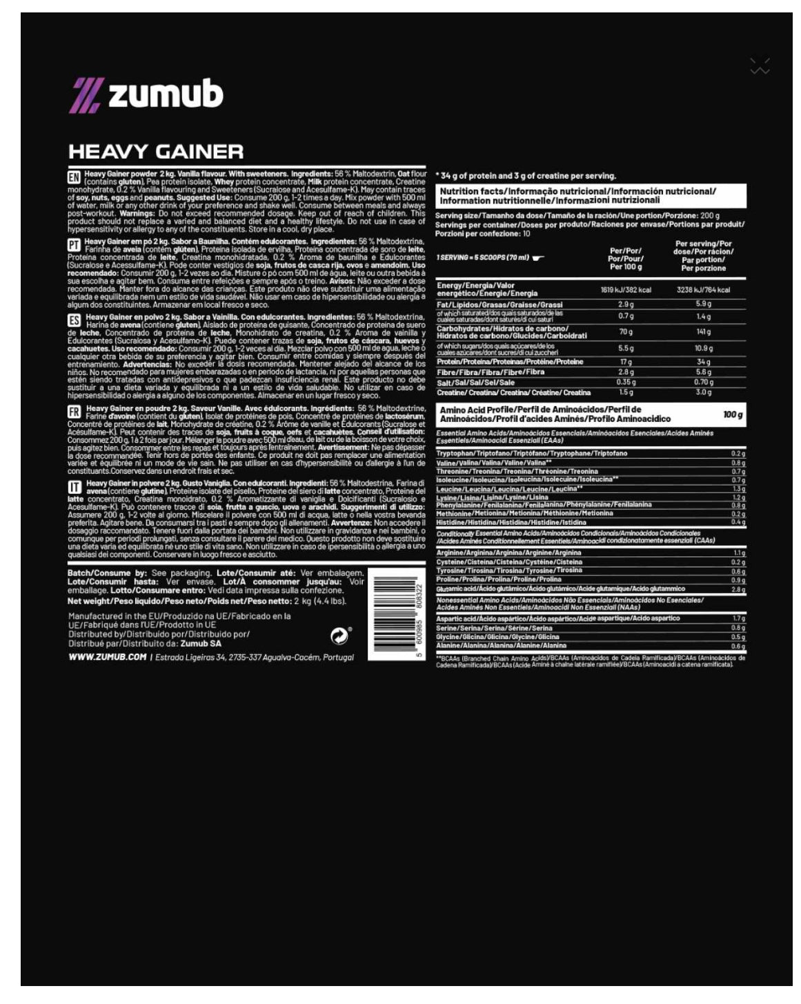 Zumub Heavy Gainer é un suplemento deportivo cunha fórmula completa que se centra no aumento de volume eficiente e nas ganancias extremas.