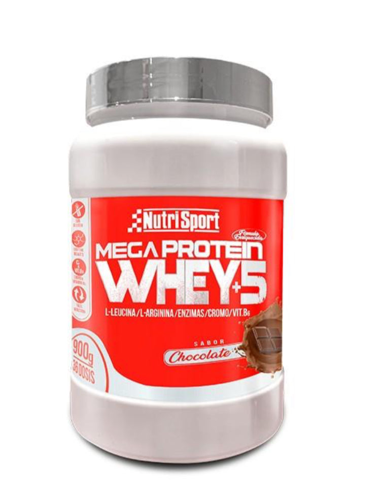 Mega Protein Whey +5 combina concentrado de soro de leite (WPC) con 5 ingredientes activos como os aminoácidos L-arxinina e L-leucina, vitaminas B6, cromo e extractos proteolíticos.