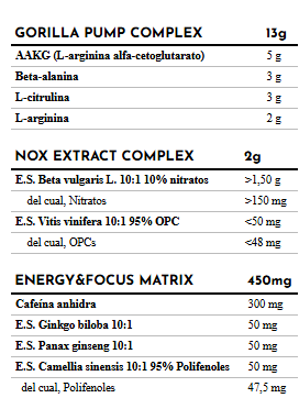 IngredientesAAKG (L-arginina alfa-cetoglutarato), beta-alanina, L-citrulina, acidulante (ácido cítrico), L-arginina, extracto seco de raíz de remolacha 10:1 con 10% de nitratos (Beta vulgaris L.), antiaglomerante (dióxido de silicio), cafeína anhidra, aromas, extracto seco de ginkgo 10:1 (Ginkgo biloba), extracto seco de ginseng 10:1 (Panax ginseng), extracto seco de té verde 10:1 con 95% de polifenoles (Camellia sinensis), extracto seco de semilla de uva 10:1 con 95% de OPCs (Vitis vinifera), colorante (beta-caroteno), edulcorantes (sucralosa, acesulfamo K).